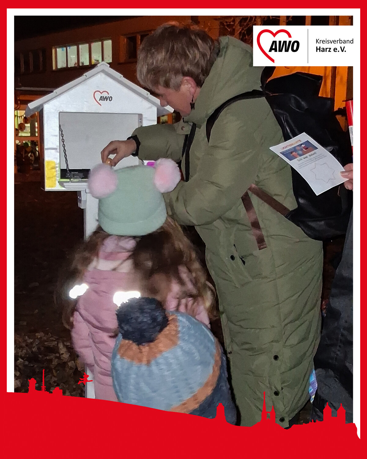Vor der Kindertagesstätte wurde eine neue Stempelstelle der Aktion AWO Aufbruch feierlich mit einem bunten Stempelhäuschen eröffnet. Fröhlich jauchzend wurden die ersten Stempel sogleich auf die Lichterkarte „Ich war dabei“ gesetzt, um als Andenken mit nach Hause genommen zu werden.