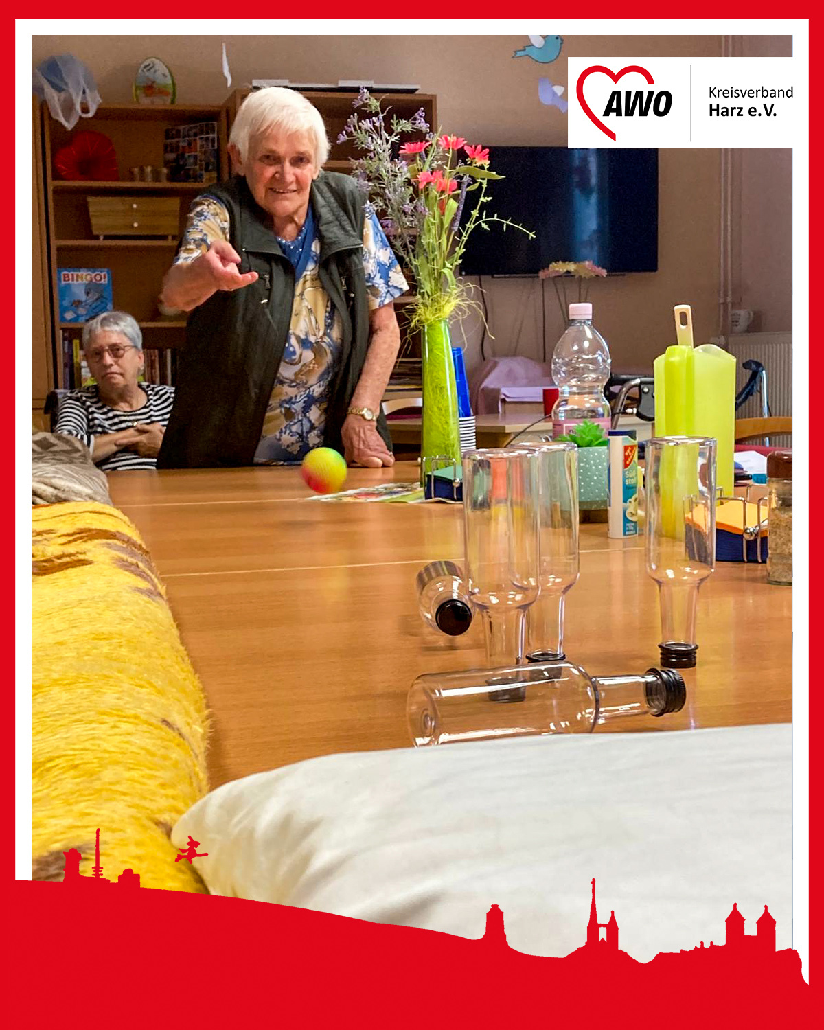Beim Tischkegeln in der AWO-Tagespflege durfte jeder drei Mal versuchen, alle "Pins" abzuräumen. Dabei waren Koordination, Fingerfertigkeit und Kraft gefragt – eine tolle Kombination aus Training und Spaß. Es ist nicht nur gelungen, die "Pins" zu treffen, sondern es wurde auch der ein oder andere Gast mal getroffen, was für einige Lacher sorgte.