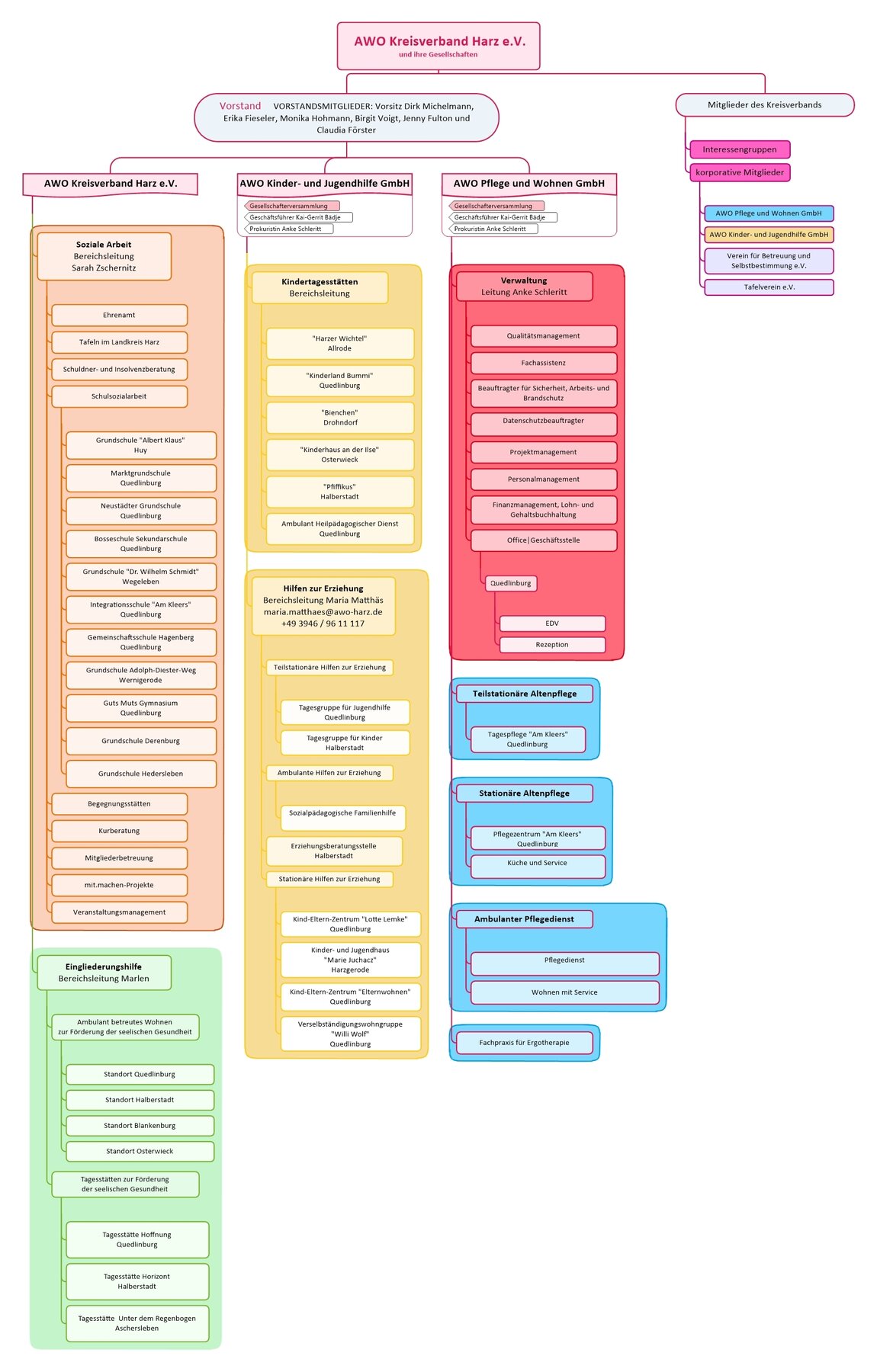 Nebem dem AWO Kreisverband Harz e. V. betreiben die AWO Kinder- und Jugendhilfe GmbH sowie die AWO Pflege und Wohnen GmbH verschiedenste Einrichtungen im Landkreis. Im Organigramm wird der Aufbau des Verbands und der Gesellschaften deutlich.